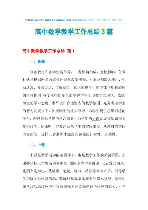 Mistakes occur in the details, and success depends on the system.悉心整理祝您一臂之力(页眉可删)高中数学教学工作总结3篇高中数学教学工作总结篇1一、备课分备教材和备学生两部分,二者相辅相成,互相影响。