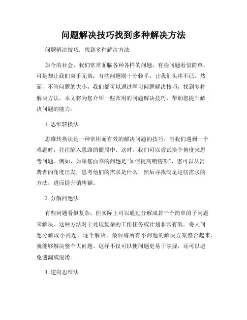 小学数学解决问题多样化的方法小学数学是培养学生数学思维和解决问题能力的重要阶段,教师在教学中需要运用多样化的方法来提高学生的数学解决问题的能力。