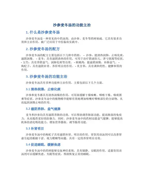 沙参麦冬汤的功能主治和用量一、功能主治沙参麦冬汤是一种中药汤剂,由沙参和麦冬作为主要成分,具有多种功能主治。