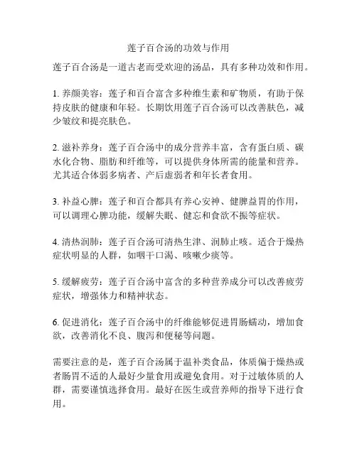 2. 滋补养身:莲子百合汤中的成分营养丰富,含有蛋白质、碳水化合物、脂肪和纤维等,可以提供身体所需的能量和营养。