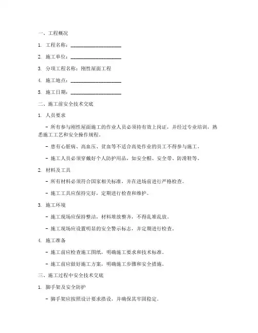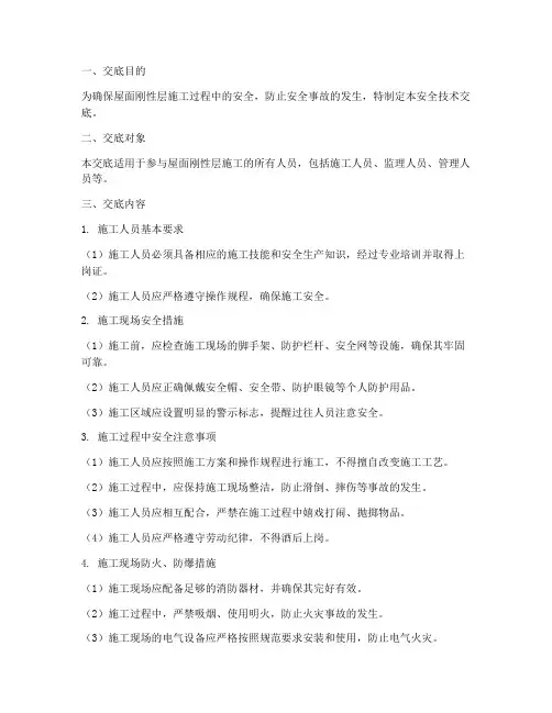 一、交底目的为确保屋面刚性层施工过程中的安全,防止安全事故的发生,特制定本安全技术交底。