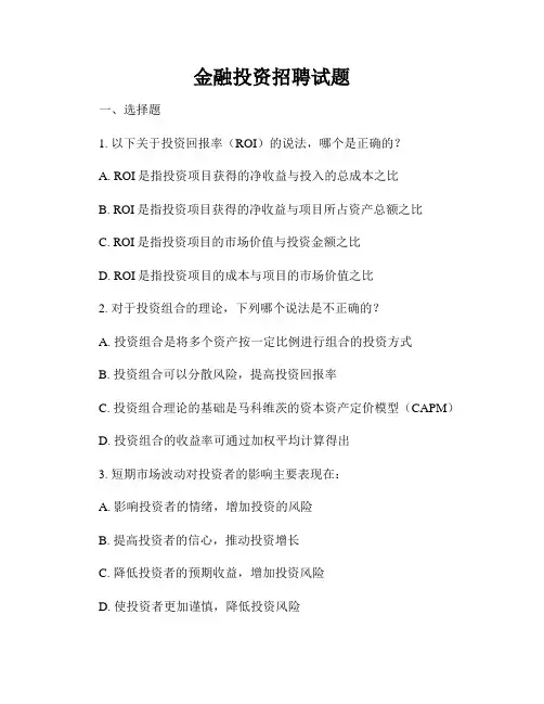 投资公司招聘笔试题投资公司招聘笔试题及答案(融资主管类)非常感谢您的到来,为了对您有一个全面的了解,希望您能回答下面的问题,谢谢合作;答题标准时间:45分钟。