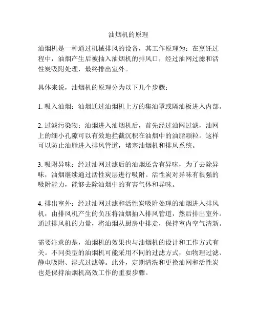 三、排风原理3.1 排风管道:油烟机内部连接着排风管道,将净化后的空气排出室外。
