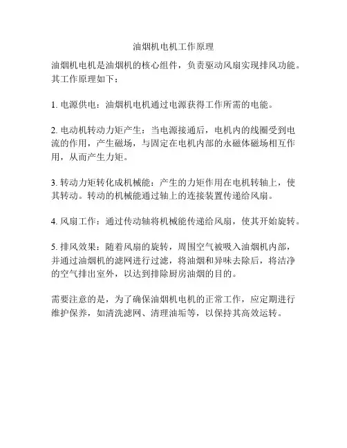 一、工作原理概述家用油烟机的工作原理基于物理原理和机械运作。
