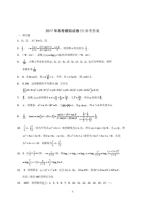 2017年高考模拟试卷(1)参考答案一、填空题1.()12,.A B =()12,.2.12. (2)(1)2i 13.1i (1)(1)2i i iz i i ++++===--+,则复数z 的实部为 12.3.(-9,+∞).函数5()log (9)f x x =+的单调增区间(-9,+∞).4. 536.点数之和是6包括(15)(24)(33)(42)(15),,,,,,,,,共5种情况,则所 求概率是536.5. 8.若613x =,则1326x =>,不符;若513x +=,则82x =>.6. 0. 244.这组数据的平均数为10,方差为222221(109.4)(109.7)(109.8)(1010.3)(1010.8)0.245⎡⎤-+-+-+-+-=⎣⎦. 7. 76.函数()f x 的周期4(3T π=⨯)43π7π+=,又Τω2π=,所以ω的值为76.8. π.依题意,2220+⋅-=a a b b ,又1==a b ,故1⋅=a b ,则a 与b 的夹角为π. 9. 113.()()()()11tan tan 25tan tan 111tan tan 125αββααββαββ--+=-+===⎡⎤⎣⎦---⨯-113. 10. 115⎡⎤-⎢⎥⎣⎦,.因为不等式2 >0ax bx c ++的解集为()1 5-,,所以(1)(5)>0a x x +-,且0a <,即245>0ax ax a --,则45b a c a =-=-,,则2 0cx bx a ++≤即为254 0ax ax a --+≤,从而254 1 0x x +-≤,故解集为115⎡⎤-⎢⎥⎣⎦,. 11.3.由121x y +=得,02y x y =>-,则()222222222log log log log log 22y y x y xy y y -++===-- ()224log 24log 832y y ⎡⎤=-++=⎢⎥-⎣⎦≥. 12. 5.易得圆C :22(1)9x y -+=,定点A (10)-,,EA ED =,则3EC EA EC ED +=+=, 从而三角形AEC 的周长为5.13. 2027.易得数列{}n b :1,3,5,6,7,9,10,11,12,13,14,15,17,…,则1137++++…12121k k k ++-=--,当10k =,12120372017k k +--=>,2037201720-=,从而第2017项为1121202027--=. 14. ()()5114-∞-,,.{}()max 11f x x x =-+,2()()g x x k k =+∈R 恰有4个零点, 当54k =时,()f x 与()g x 相切.如图,结合图形知,实数k 的取值范围是())5114-∞-,,. 二、解答题15. (1)因为cos cos 02C C +=,所以22cos cos 1022C C +-=,解得cos 12C =-或1cos 22C =, 又0C π<< ,故22C π0<<,从而23C π=,即23C π=.(2)由余弦定理2222cos c a b ab C =+-得,221a b ab ++=, ① 由三角形ABC 的面积1sin 2ab C ==13ab =, ②由①②得,a b ==.16. (1)因为AB //DE ,又AB ⊄平面DEF , DE ⊂平面DEF ,所以AB //平面DEF , 同理BC //平面DEF , 又因为ABBC C =,A B B C ⊂,平面ABC ,所以平面ABC //平面DEF . (2)因为CAB ∠是二面角C -AD -E 的平面角,所以CA AD BA AD ⊥⊥,, 又因为CA AB A =, AB ,CA ⊂平面ABC ,所以DA ⊥平面ABC , 又DA ⊂平面DABE ,所以平面ABC ⊥平面DABE .17. (1)过点P 分别作AB ,AD 的垂线,垂足分别为E ,F , 则△PNF 与△MPE 相似,从而PF NF EM PE=,所以2121n m -=-,即211m n+=. 欲使剩下木板的面积最大,即要锯掉的三角形废料MAN 的面积 12S mn =最小.由211m n =+≥8mn ≥ (当且仅当21m n =,即4m =,2n =时,“=”成立),此时min 4S =(平方分米). (2)欲使剩下木板的外边框长度最大,即要m n +最小.由(1)知,()()212333n m m n m n m n m n +=++=++=≥,(当且仅当2n m m n =即2m =,1n 时,“=”成立),答:此时剩下木板的外边框长度的最大值为33-分米.18. (1)由椭圆C :2221x y a+=(a >1)知, 焦距为2=, 解得a =因为a >1,所以a =(第17题)(2)设直线1y kx =+被椭圆截得的线段长为ΑΡ, 由22211y kx x y a=+⎧⎪⎨+=⎪⎩,,得()2222120a k x a kx ++=, 解得10x =,222221a kx a k=-+.因此2122221a kΑΡx a k=-=+. (3)因为圆与椭圆的公共点有4个,由对称性可设y 轴左侧的椭圆上有2个不同的公共点为P ,Q ,满足AP AQ =.记直线AP ,AQ 的斜率分别为1k ,2k ,且1k ,20k >,12k k ≠. 由(2)知,1AP2AQ ,12,所以22222222121212)1(2)0k k k k a a k k ⎡⎤-+++-=⎣⎦(,因为1k ,20k >,12k k ≠,所以22222212121(2)0k k a a k k +++-=, 变形得,()()22221211111(2)a a k k ++=+-, 从而221+(2)1a a ->,解得a则)1c e a =. 19. (1)因为函数()f x 为偶函数,所以()()f x f x -=-,即()()()323222x a x b x c x ax bx c -+-+-+=----, 整理得,20ax c +=,所以0a c ==,从而3()2f x x bx =+,又函数()f x 图象过点(12)-,,所以4b =-. 从而3()24f x x x =-.(2)①32()2()f x x ax bx c a b c =+++∈R ,,的导函数2()62f x x ax b '=++. 因为()f x 在1x =和2x =处取得极值,所以(1)0(2)0f f ''==,, 即6202440a b a b ++=⎧⎨++=⎩,,解得912a b =-=,. ②由(1)得32()2912()f x x x x c c =-++∈R ,()6(1)(2)f x x x '=--. 列表:显然,函数()f x 在[0,3]上的图象是一条不间断的曲线.由表知,函数()f x 在[0,3]上的最小值为(0)f c =,最大值为(3)9f c =+. 所以当0c >或90c +<(即9c <-)时,函数()f x 在区间[03],上的零点个数为0. 当50c -<<时,因为(0)(1)(5)0f f c c =+<,且函数()f x 在(0,1)上是单调增函数,所以函数()f x 在(0,1)上有1个零点.当54c -<<-时,因为(1)(2)(5)(4)0f f c c =++<,且()f x 在(1,2)上是单调减函数, 所以函数()f x 在(1,2)上有1个零点.当94c -<<-时,因为(2)(3)(4)(9)0f f c c =++<,且()f x 在(2,3)上是单调增函数, 所以函数()f x 在(2,3)上有1个零点.综上,当0c >或9c <-时,函数()f x 在区间[03],上的零点个数为0;当95c -<-≤或40c -<≤时,零点个数为1; 当4c =-或5c =-时,零点个数为2;当54c -<<-时,零点个数为3.20.(1)依题意,11111166022a a a aa b ++=- (当且仅当111a a =时,等号成立).(2)易得()1342n n --=--,当n 为奇数时,()13420n n --=--<,所以43n <,又*n ∈N ,故1n =,此时111a b ==-;当n 为偶数时,()13420n n --=-->,所以43n >,又*n ∈N ,故246n =,,,…若2n =,则222a b ==,若4n =,则448a b ==, 下证:当6n ≥,且n 为偶数时,()1342n n --<--,即()12134n n --->-.证明:记()12()34n p n n ---=-,则()()()112434(2)341()32322n n n p n n p n n n +----+-=⋅=>++--, 所以()p n 在6n ≥,且n 为偶数时单调递增, 从而17()(6)17p n p >=>.综上,124n =,,,所以m 的值为3. (3)证明:假设3m =,不妨123n n n <<,满足11n n a b =,22n n a b =,33n n a b =, 设1(1)n a a n d =+-,11n n b b q -=,其中0q >,且1q ≠, 记11()(1)xb f x a x d q q=+--⋅, 则1()ln x b f x d q q q '=-⋅,()21()ln x b f x q q q''=-⋅,由参考结论,知112()n n ξ∃∈,,1()0f ξ'=,223()n n ξ∃∈,,2()0f ξ'=, 同理,12()ηξξ∃∈,,()0f η''=,即()21()ln 0b f q q qηη''=-⋅=, 这与()21()ln 0b f q q qηη''=-⋅≠矛盾,故假设不成立,从而3m ≠.第Ⅱ卷(附加题,共40分)A .因为ABCD 是圆的内接四边