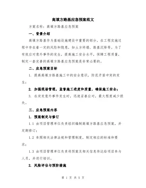 三、应急预案的主要措施1. 事前预防措施:a. 建立完善的技术规范和工程标准,确保施工过程中土方填筑的均匀性和稳定性;b. 实施地质勘察,对高填方路基的地质条件进行深入了解,预估可能出现的应急情况;c. 提前进行风险评估,制定可行的施工方案,减少可能的风险。