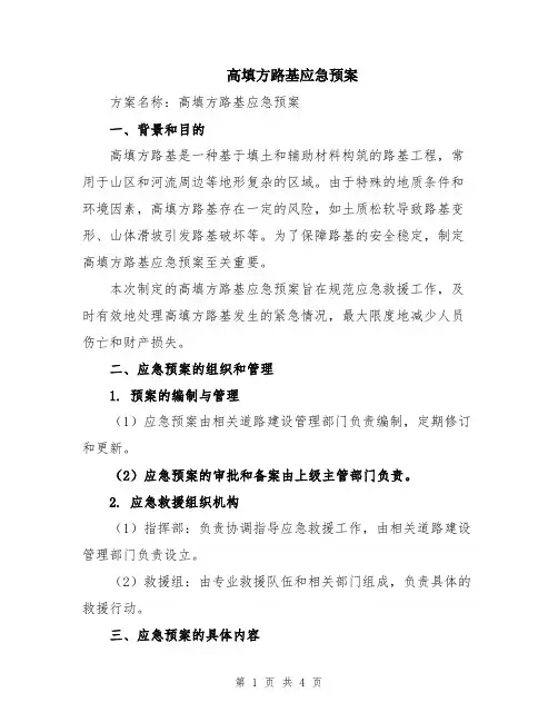 高填方路基应急预案方案名称:高填方路基应急预案一、背景概述高填方路基是指工程施工中采用填方填筑的道路路基方式,该方式相对于挖方填筑的方式在节约土方开挖和处理方面具有明显优势。