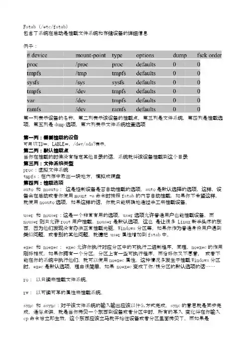 /etc/fstab详解1 fstab文件的作用文件/etc/fstab存放的是系统中的文件系统信息。