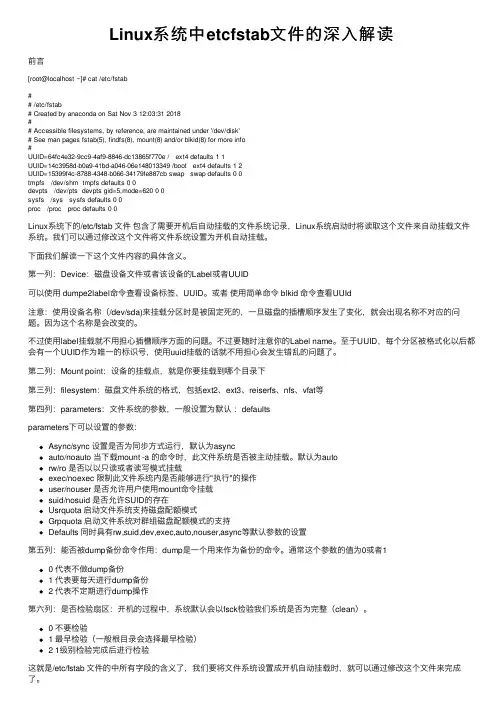 Linux系统中etcfstab⽂件的深⼊解读前⾔[root@localhost ~]# cat /etc/fstab## /etc/fstab# Created by anaconda on Sat Nov 3 12:03:31 2018## Accessible filesystems, by reference, are maintained under '/dev/disk'# See man pages fstab(5), findfs(8), mount(8) and/or blkid(8) for more info#UUID=64fc4e32-9cc9-4af9-8846-dc13865f770e / ext4 defaults 1 1UUID=14c3958d-b0a9-41bd-a046-06e148013349 /boot ext4 defaults 1 2UUID=15399f4c-8788-4348-b066-34179fe887cb swap swap defaults 0 0tmpfs /dev/shm tmpfs defaults 0 0devpts /dev/pts devpts gid=5,mode=620 0 0sysfs /sys sysfs defaults 0 0proc /proc proc defaults 0 0Linux系统下的/etc/fstab ⽂件包含了需要开机后⾃动挂载的⽂件系统记录,Linux系统启动时将读取这个⽂件来⾃动挂载⽂件系统。