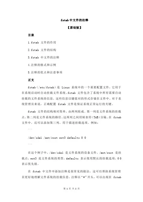 例如,在 fstab 文件中添加如下注释:```# /dev/sda1 is the root filesystem/dev/sda1 /mnt/root ext3 defaults 0 0# /dev/sdb1 is the swap filesystem/dev/sdb1 /mnt/swap swap sw 0 0```这样,当系统管理员需要了解某个挂载条目的详细信息时,可以直接查看注释内容。