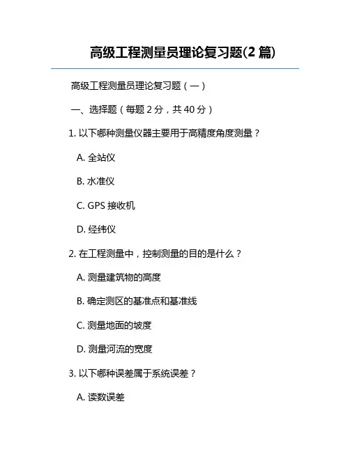 高级工程测量员理论复习题(3篇)第一篇:基础理论与测量工具一、选择题1. 下列哪种单位不是长度单位?A. 米 (m)B. 厘米 (cm)C. 千克 (kg)D. 英寸 (in)2. 在测量过程中,下列哪项不是减小误差的有效方法?A. 重复测量B. 使用更高精度的仪器C. 增加测量距离D. 采用更科学的测量方法3. 下列哪种工具不适合用于建筑工程测量?A. 水准仪B. 全站仪C. 激光测距仪D. 电子秤二、填空题1. 工程测量中,通常将地球视为一个半径为______的规则球体。