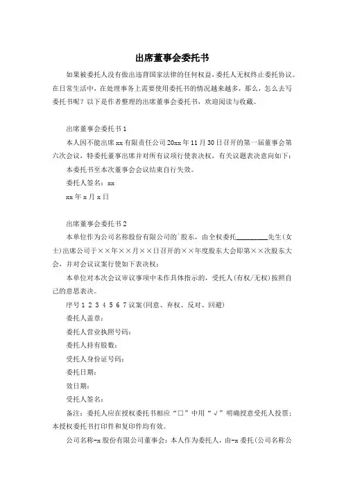 特此授权委托人签字:日期:代理人签字:日期:出席董事会委托书范本(四)尊敬的董事会:本人XXX,现任公司董事会成员之一,特此委托代表我出席公司董事会。