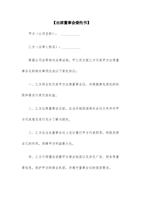 【出席董事会委托书】甲方(公司名称): ____________乙方(出席人姓名):___________根据公司法等相关法律法规,甲乙双方就乙方代表甲方出席董事会议的相关事项达成以下委托协议:一、乙方将全权代表甲方出席董事会议,并根据事先委托的权限和要求行使代表权益。