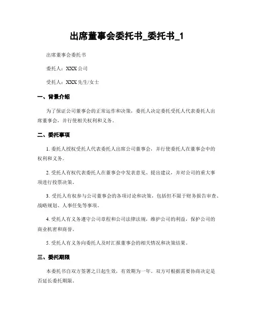 出席董事会委托书_委托书_1出席董事会委托书委托人:XXX公司受托人:XXX先生/女士一、背景根据XXX公司董事会的决议,委托人决定委托受托人代表委托人出席董事会,并行使与董事会相关的一切权利和义务。