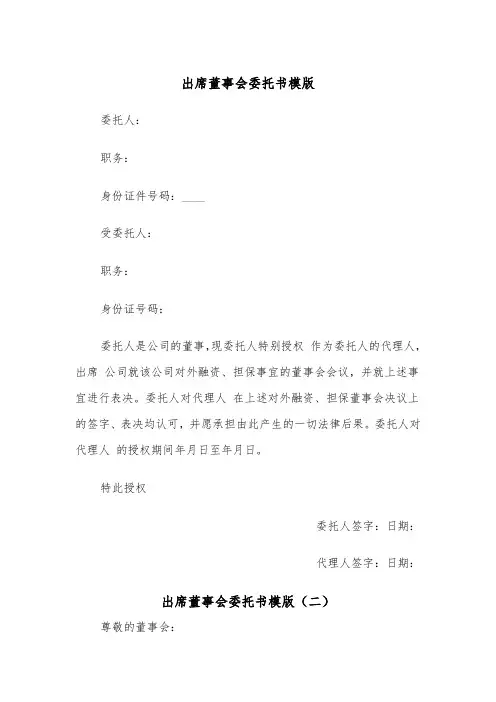 特此委托委托人:二○____年____月____日出席董事会委托书范本(三)委托人:职务:身份证件号码:____受委托人:职务:身份证号码:委托人是公司的董事,现委托人特别授权作为委托人的代理人,出席公司就该公司对外融资、担保事宜的董事会会议,并就上述事宜进行表决。