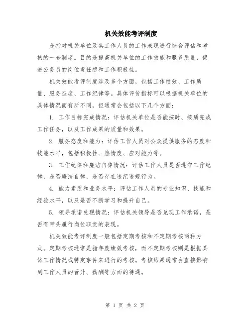 一、制度背景和目的效能评估制度的制定背景是为了解决组织在工作过程中可能存在的问题和障碍,以及提高组织的工作效能。
