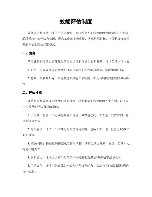一、概述效能评估制度是为了提高组织的工作效能而设计的一套评估体系。