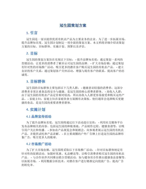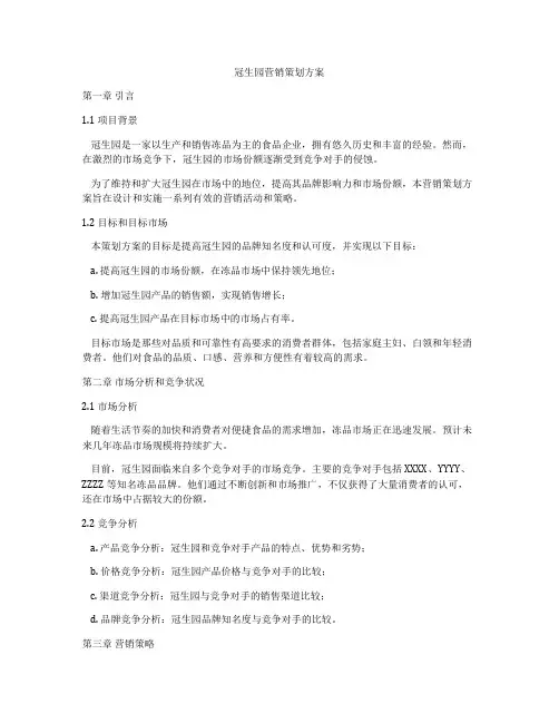 冠生园营销策划方案第一章引言1.1 项目背景冠生园是一家以生产和销售冻品为主的食品企业,拥有悠久历史和丰富的经验。