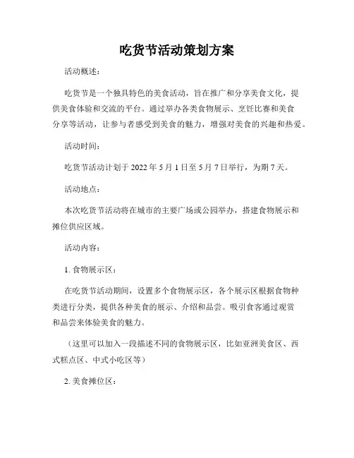 四、活动流程活动持续时间:3天第一天:- 开幕仪式:由主办方代表致辞,宣布“吃货节”正式开始。