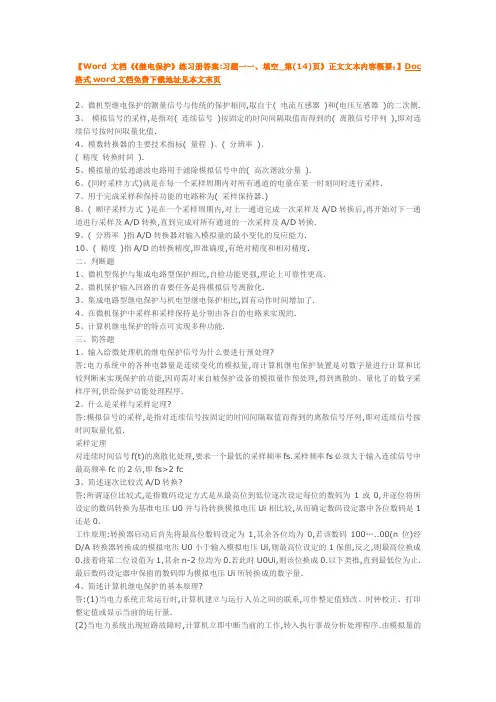 选择题:8我国继电保护技术发展过了五个阶段,其发展顺序是CA机电型晶体管型整流型集成电路型微机型B机电型整流型集成电路型晶体管型微机型C机电型整流型晶体管型集成电路型微机型9电力系统最危险的故障CA单相接地 B两相短路 C 三相短路10电力系统短路时最严重的后果是CA电弧使故障设备损坏 B使用户的正常工作遭到破坏C破坏电力系统运行的稳定性11.继电保护的灵敏度系数K1m要求(C)(A)K1m<1 (B)K1m=1 (C)K1m>112.线路保护一般装设两套,它们是 (B)(A)主保护(B)一套为主保护,另一套为后备保护(C)后备保护判断题:13.电气设备过负荷时,继电保护应将过负荷保护设备切除。