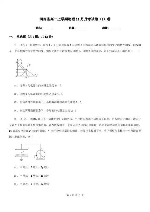 河南省高二上学期物理11月月考试卷(I)卷姓名:________ 班级:________ 成绩:________一、单选题 (共6题;共12分)1. (2分)如图所示,直线Ⅰ、Ⅱ分别是电源1与电源2的路端电压随输出电流的变化的特性图线,曲线Ⅲ是一个小灯泡的伏安特性曲线,如果把该小灯泡分别与电源1、电源2单独连接,则下列说法不正确的是()A . 电源1与电源2的内阻之比是11:7B . 电源1与电源2的电动势之比是1:1C . 在这两种连接状态下,小灯泡消耗的功率之比是1:2D . 在这两种连接状态下,小灯泡的电阻之比是1:22. (2分) (2016高二上·福建期中) 如图所示,平行板电容器上极板带正电荷,且与静电计相连,静电计金属外壳和电容器下极板都接地,在两极板间有一个固定在P点的正点电荷,以E表示两极板间电场的电场强度,Ep表示点电荷在P点的电势能,θ表示静电计指针的偏角,若保持上极板不动,将下极板向上移动一小段距离至图中虚线位置,则()A . θ增大,E增大,Ep增大B . θ增大,E增大,Ep减小C . θ减小,E不变,Ep增大D . θ减小,E不变,Ep减小3. (2分)用电压表、电流表测定a、b两节干电池的电动势Ea、Eb和内电阻ra、rb时,画出的图线如图所示,则由此图线可知()A . Ea>Eb、ra>rbB . Ea>Eb、ra<rbC . Ea<Eb、ra>rbD . Ea<Eb、ra<rb4. (2分) (2020高二上·黄陵期末) 一电池外电路断开时的路端电压为3V,接上8 的负载电阻后路端电压降为2.4V,则可以判定电池的电动势E和内电阻r为()A . E=2.4V,r=1B . E=3V,r=2C . E=2.4V,r=2D . E=3V,r=15. (2分)如图所示,小磁针正上方的直导线与小磁针平行,当导线中有电流时,小磁针会发生偏转.首先观察到这个实验现象的物理学家和观察到的现象是()A . 洛伦兹,小磁针的N极转向纸内B . 法拉第,小磁针的S极转向纸内C . 库仑,小磁针静止不动D . 奥斯特,小磁针的N极转向纸内6. (2分) (2019高二上·丰台期中) 下列家用电器中,主要利用电流热效应的是()A . 电风扇B . 电热毯C . 电冰箱D . 洗衣机二、多选题 (共6题;共15分)7. (2分) (2017高二上·晋江期末) 如图所示,在真空中有两个固定的等量异种点电荷+Q和﹣Q.直线MN 是两点电荷连线的中垂线,O是两点电荷连线与直线MN的交点.a、b是两点电荷连线上关于O的对称点,c、d是直线MN上的两个点.下列说法中正确的是()A . c点的场强等于d点的场强;将一检验电荷沿MN由c移动到d,所受电场力先增大后减小B . c点的场强等于d点的场强;将一检验电荷沿MN由c移动到d,所受电场力先减小后增大C . a点的场强等于b点的场强;将一检验电荷沿MN由c移动到d,所受电场力先增大后减小D . a点的场强大于b点的场强;将一检验电荷沿MN由c移动到d,所受电场力先减小后增大8. (3分)如图所示,图线a是某一电源的U﹣I曲线,图线b是一定值电阻的U﹣I曲线.若将该电源与该定值电阻连成闭合电路(已知该电源的内阻r=2.0Ω),则()A . 该定值电阻为6ΩB . 该电源的电动势为20VC . 将3只这种电阻并联作为外电阻,电源输出功率最大D . 将2只这种电阻串联作为外电阻,电源输出功率最大9. (3分) (2018高二下·鲁甸期中) 某一电学黑箱内可能有电容器、电感线圈、定值电阻等元件,在接线柱间以如图所示的“Z”字形连接(两接线柱间只有一个元件).为了确定各元件种类,小华同学把DIS计算机辅助实验系统中的电流传感器(相当于电流表)与一直流电源、滑动变阻器、开关串联后,分别将AB、BC、CD接入电路,闭合开关,计算机显示的电流随时间变化的图象分别如图A , B , C所示,则如下判断中正确的是()A . AB间是电容器B . BC间是电感线圈C . CD间是电容器D . CD间是定值电阻10. (2分) (2019高二上·张家口月考) 如图所示为简单欧姆表原理示意图,其中电流表的满偏电流Ig=1mA,内阻Rg=300Ω,可变电阻R的最大阻值为3kΩ,电池的电动势E=1.5V,内阻r=10Ω。