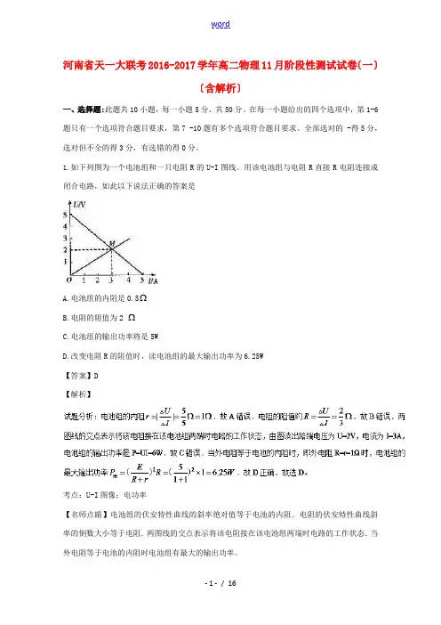 用该电池组与电阻R直接R电阻连接成闭合电路,如此以下说法正确的答案是A.电池组的内阻是0.5ΩB.电阻的阻值为2 ΩC.电池组的输出功率将是5WD.改变电阻R的阻值时,读电池组的最大输出功率为6.25W【答案】D【解析】考点:U-I图像;电功率【名师点睛】电池组的伏安特性曲线的斜率绝对值等于电池的内阻.电阻的伏安特性曲线斜率的倒数大小等于电阻.两图线的交点表示将该电阻接在该电池组两端时电路的工作状态.当外电阻等于电池的内阻时电池组有最大的输出功率。