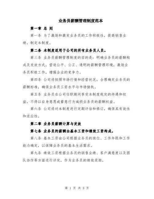 业务员薪酬管理制度范本第一章总则第一条为了规范公司的业务员薪酬管理,激励业务员积极开展工作,提高公司销售业绩,特制定本制度。