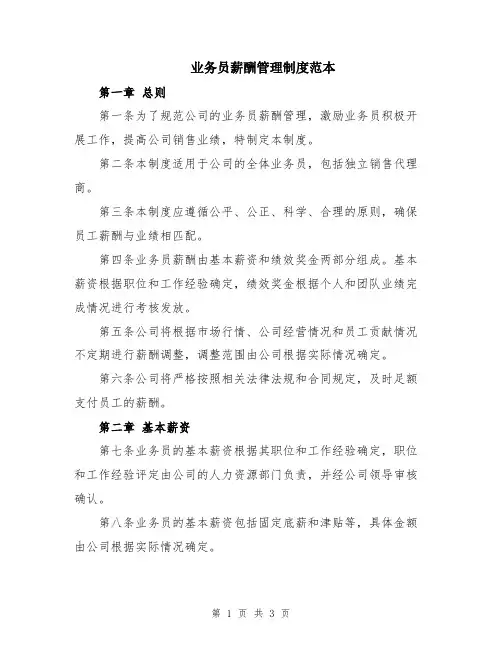 业务员薪酬管理制度范本薪酬管理制度范本:第一章总则第一条为了规范业务员的薪酬管理,激励业务员积极工作,提高业绩,提高员工的薪酬水平,制定本制度。