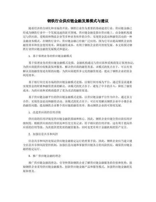 钢铁行业供应链金融发展模式与建议随着经济的全球化和市场的开放,钢铁行业作为重要的基础建设行业,供应链金融已经成为钢铁行业中一个发展迅速的新兴领域。