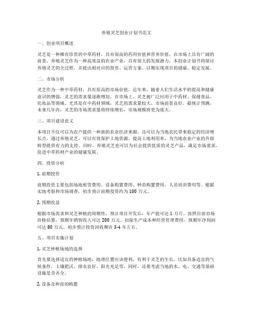 二、项目概述1. 项目名称:养殖灵芝项目2. 项目地点:本项目将选址在适宜灵芝生长的区域,也可以选择室内人工环境进行养殖。