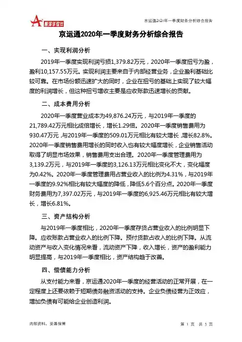 京运通2020年一季度财务分析综合报告京运通2020年一季度财务分析综合报告一、实现利润分析2019年一季度实现利润亏损1,379.82万元,2020年一季度扭亏为盈,盈利10,157.55万元。