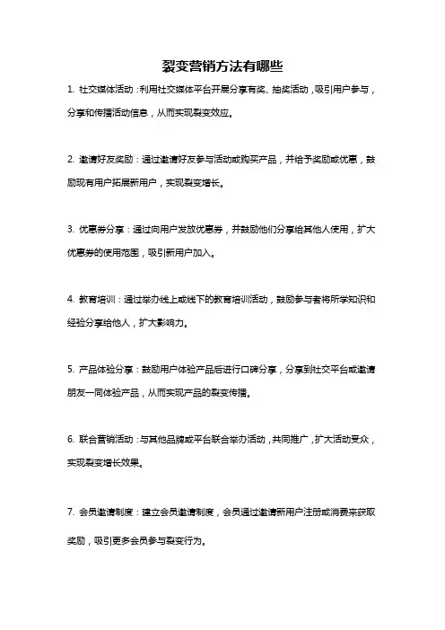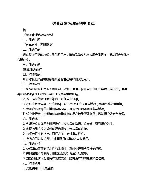 裂变营销活动策划书3篇篇一《裂变营销活动策划书》一、活动主题[具体活动主题]二、活动目的通过裂变营销活动,吸引更多潜在客户,提高品牌知名度和销售量。