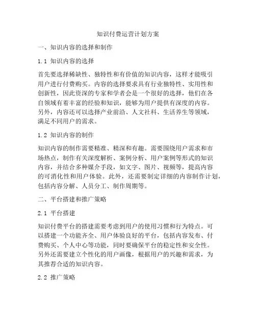 知识付费运营计划方案一、知识内容的选择和制作1.1 知识内容的选择首先要选择稀缺性、独特性和有价值的知识内容,这样才能吸引用户进行付费购买。