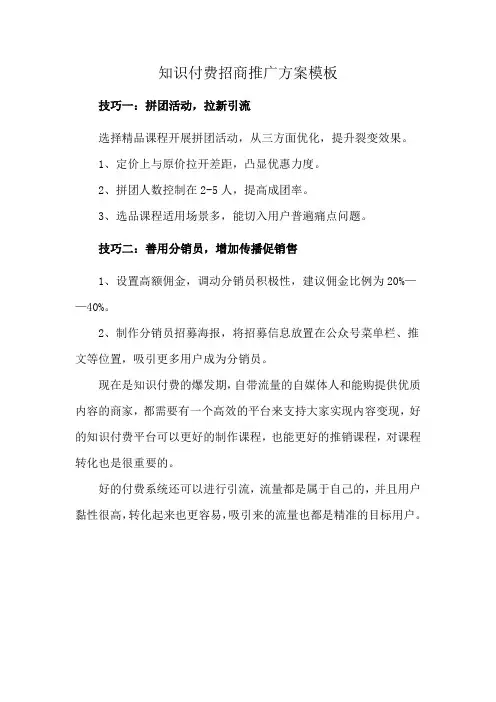 2.2 推广策略推广是知识付费运营的关键环节,需要采用多种方式和渠道进行推广。