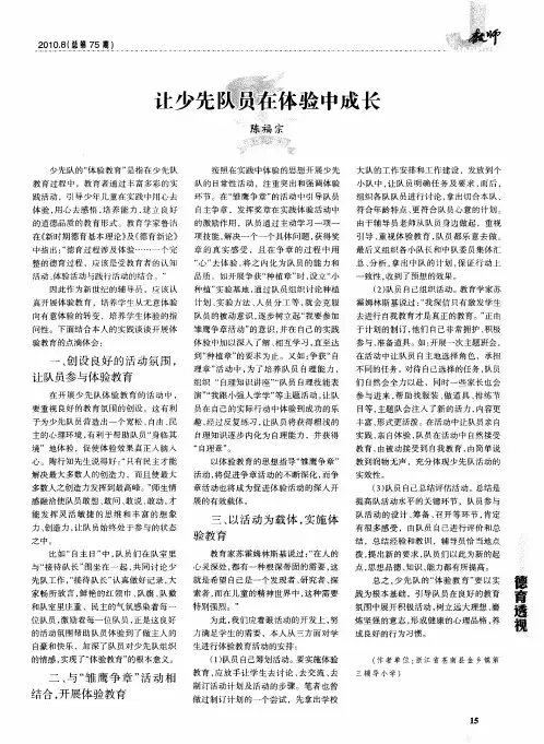 “体验”的重要意义一、在体验中提高思想道德认识少先队组织丰富多彩的活动就是对少年儿童进行思想品德教育的有效途径,我们通过体验活动使他们提高思想道德认识。