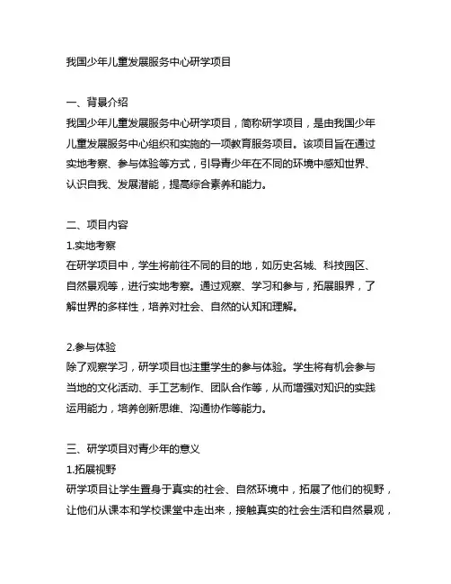 我国少年儿童发展服务中心研学项目一、背景介绍我国少年儿童发展服务中心研学项目,简称研学项目,是由我国少年儿童发展服务中心组织和实施的一项教育服务项目。