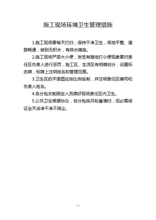 施工现场环境管理的技术措施一、防止大气(粉尘、废气)污染和危害1、施工现场垃圾杂物要及时清理。