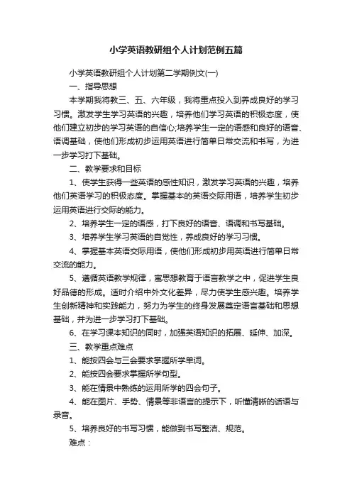 小学英语教研组个人计划第二学期例文小学英语教研组个人计划第二学期例文(一)一、指导思想本学期我将教三、五、六年级,我将重点投入到养成良好的学习习惯。
