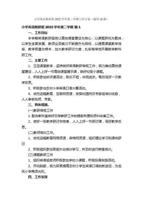 小学英语教研组个人计划第二学期例文小学英语教研组个人计划第二学期例文一、教学目标本学期的教学目标主要围绕以下三个方面展开:1.培养学生听说读写英语的能力,让孩子们在学习中提高听力理解、口语表达、阅读能力和书写技能,能够用英语进行简单的日常交流。