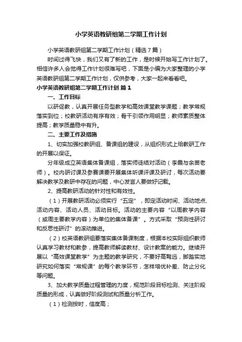 英语教研组第二学期工作计划样本一、指导思想____年我们英语教研组将重点投入到以素质教育为指挥棒的教学宗旨,激发学生学习英语的兴趣,培养他们学习英语的积极态度,使他们建立初步的学习英语的自信心;培养学生一定的语感和良好的语音、语调基础,使他们形成初步运用英语进行简单日常交流和书写,为进一步学习打下基础。