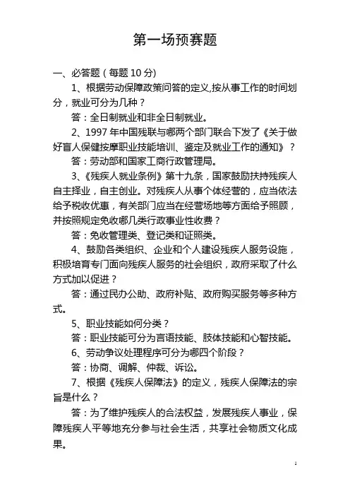 8、残疾人工作者的职业道德?答:人道、廉洁、服务、奉献抢答题(每题10分):1、肢残人活动日是几月几日答:8月11日2、劳动争议处理程序可分为哪四个阶段?答:协商;调解;仲裁;诉讼3、中央七号文件明确规定的残疾人就业保护措施有哪些?答:资金扶持、税费减免、货款贴息、社会保险补贴、岗位补贴、专产专营等。