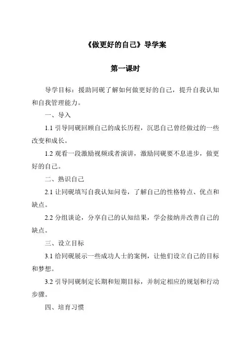 《做更好的自己》导学案一、进修目标:1. 了解如何做更好的自己,提高自我认知和自我管理能力。