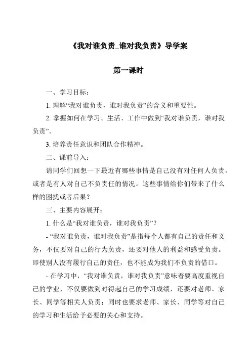 《我对谁负责_谁对我负责》导学案第一课时一、学习目标:1. 理解“我对谁负责,谁对我负责”的含义和重要性。