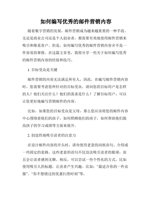 二、内容1. 编写吸引人的主题:邮件主题是吸引用户打开邮件的第一道门槛。