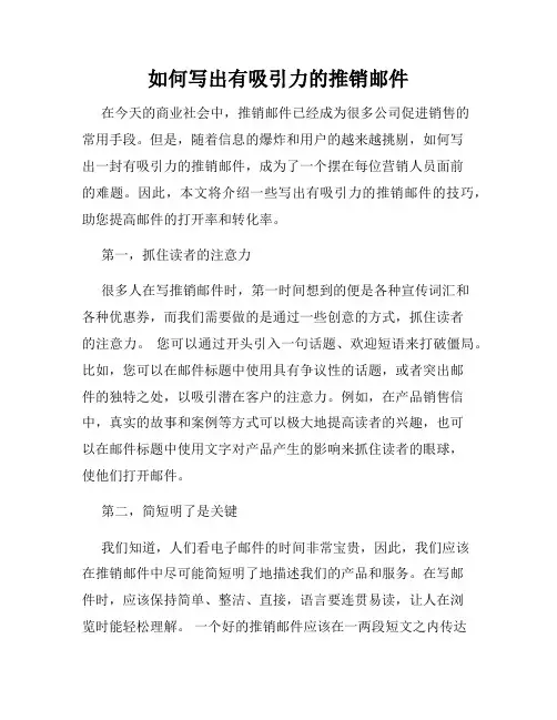 如何写出有吸引力的推销邮件在今天的商业社会中,推销邮件已经成为很多公司促进销售的常用手段。