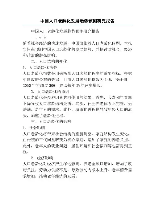中国人口老龄化发展趋势预测研究报告中国人口老龄化发展趋势预测研究报告一、引言随着社会经济的快速发展,中国面临着人口老龄化问题。