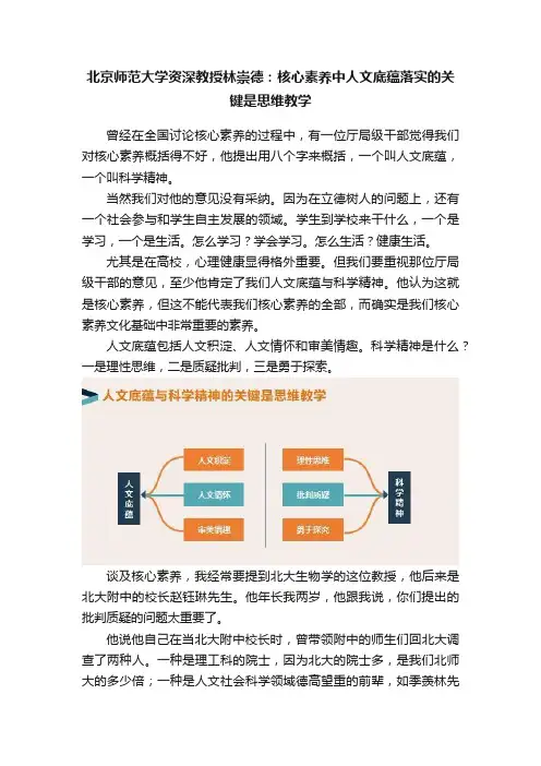 北京师范大学资深教授林崇德:核心素养中人文底蕴落实的关键是思维教学曾经在全国讨论核心素养的过程中,有一位厅局级干部觉得我们对核心素养概括得不好,他提出用八个字来概括,一个叫人文底蕴,一个叫科学精神。