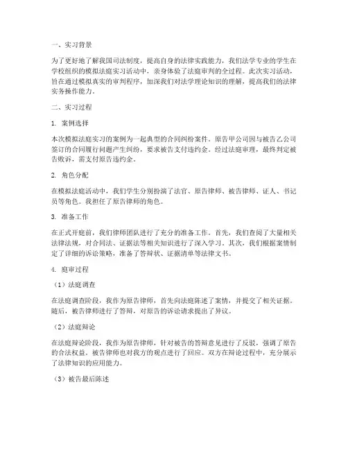 三、实习收获1. 提高法律素养通过本次模拟法庭大赛,我对法律知识有了更深入的了解,提高了自己的法律素养。