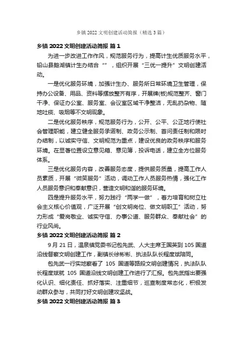 乡镇2022文明创建活动简报(精选3篇)乡镇2022文明创建活动简报篇1为进一步改进工作作风,规范服务行为,提高计生优质服务水平,铅山县鹅湖镇计生办结合“”,组织开展“三优一提升”文明创建活动。