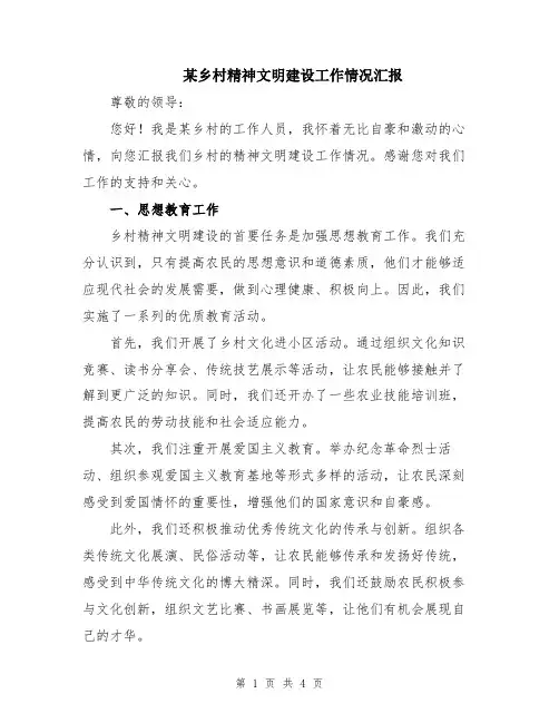 某乡村精神文明建设工作情况汇报尊敬的领导:您好!我是某乡村的工作人员,我怀着无比自豪和激动的心情,向您汇报我们乡村的精神文明建设工作情况。